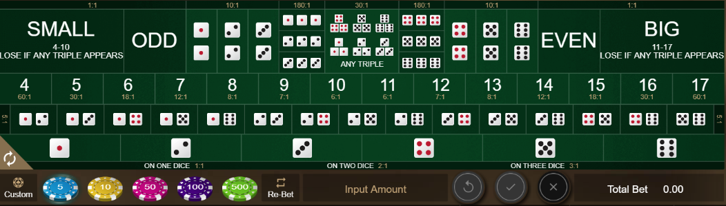 The Sic Bo board can look complex at first, but once you understand the layout, the game is very simple to play.