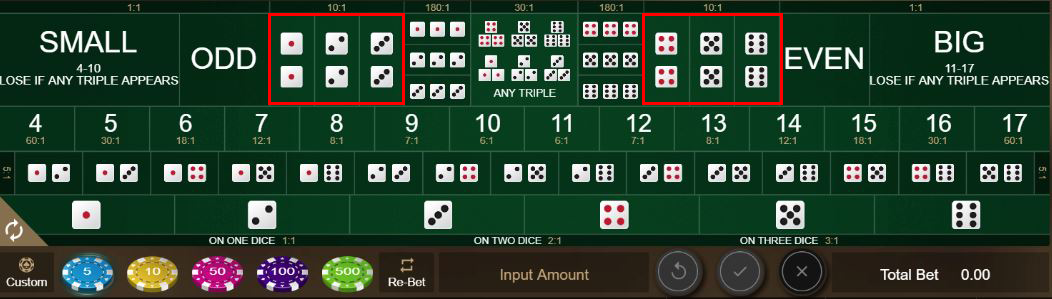Small and Big are used by every Sic Bo player, from beginners to High Rollers, but because they are nearly evens chance, we use them as part of our Lower risk Sic Bo strategy.